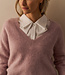 Deze blouse is uitgevoerd in een gladde, licht glanzende stof en valt op door de decoratieve kraag met strikdetail. Het model heeft lange mouwen met manchetten, een klassieke knoopsluiting en een rechte pasvorm. De unieke kraag geeft een vrouwelijke twist aan dit tijdloze ontwerp. Het model is 173 cm en draagt maat 36.
