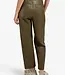 Deze eigentijdse broek is gemaakt van soepel faux leather en heeft een hoge taille met smal toelopende pijpen. Het model valt losjes op de heupen en sluit aan richting de enkels. Voorzien van steekzakken voor, opgestikte achterzakken en sierlijke stikdetails die het ontwerp extra karakter geven. De subtiele glans geeft de broek een moderne uitstraling.