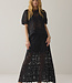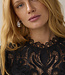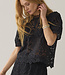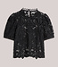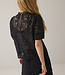 Boxy kanten top met korte pofmouwtjes en een satijnen afwerking bij de boorden. De halslijn en de onderkant zijn afgewerkt met een kanten schulprandje. De blouse heeft een splitje met een knoopsluiting in de nek. Combineer de top met de bijpassende rok.