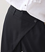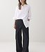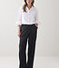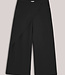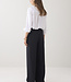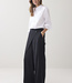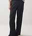 Wijde broek met aan de voorzijde een overslag vanuit de zijnaad. De broek heeft een gladde tailleband voor en een elastische achter. Op de achterkant zitten strookzakken.
