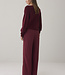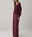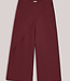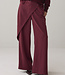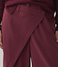 Wijde broek met aan de voorzijde een overslag vanuit de zijnaad. De broek heeft een gladde tailleband voor en een elastische achter. Op de achterkant zitten strookzakken.