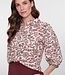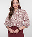 Deze blouse uit de geisha collectie heeft een sierlijk bloemetjespatroon en zit vol verfijnde details. De 3/4 mouwen met opvallende tape aan de cuffs zorgen voor een verrassend accent. Perfect om te combineren met onze burgundy pantalon of kies voor een denim voor een meer casual look.