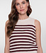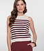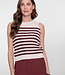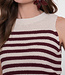 Deze mouwloze knit uit de geisha collectie heeft een strepenpatroon in ecru met burgundy. Het gebreide materiaal geeft karakter en structuur. De mouwloze snit en aansluitende pasvorm benadrukken het silhouet en maken de top perfect voor warme dagen of als layered look onder een blazer. Combineer met een bijpassende pantalon of een denim voor een stijlvolle, eigentijdse outfit.