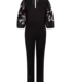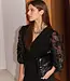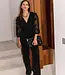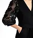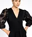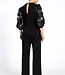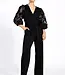 De Lizeth jumpsuit heeft een elegante aangesloten pasvorm met een diepe V-hals en een strikceintuur die het silhouet accentueert. De absolute blikvanger zijn de volumineuze, transparante mouwen van organza, rijkelijk versierd met bloemenapplicaties in ton-sur-ton zwart. De rechte pijpen zorgen voor een tijdloos en flatterend silhouet, terwijl het materiaal zorgt voor draagcomfort en een luxe uitstraling.